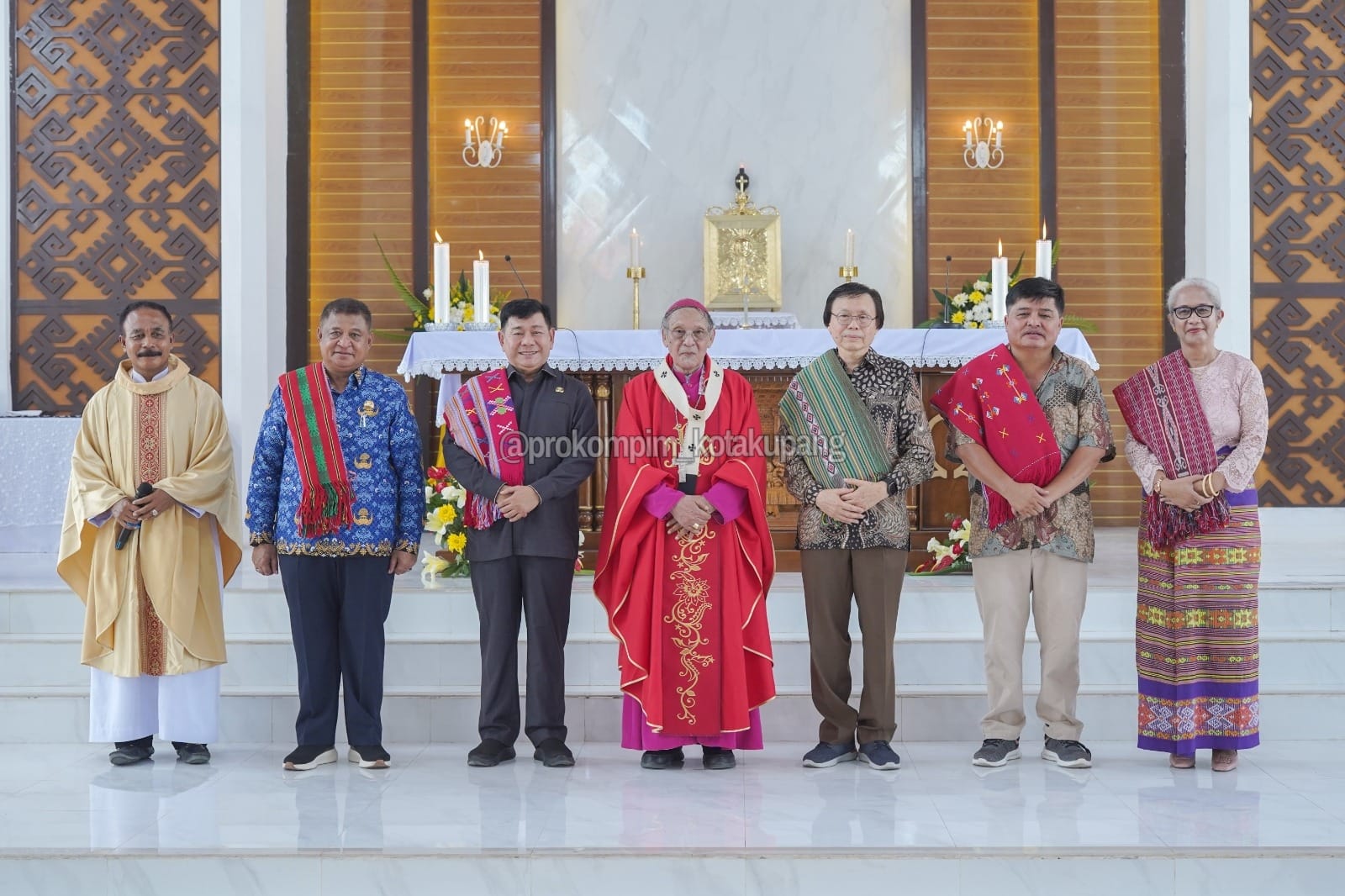Kupang, MN – Penjabat Wali Kota Kupang, Fahrensy P. Funay menghadiri misa penahbisan Gereja Katolik Kristus Raja Katedral Kupang dan syukuran 49 tahun tahbisan imam dari Uskup Agung Kupang, Mgr. Petrus Turang, Senin (18/12). Gereja yang dibangun dengan anggaran pemerintah pusat itu belum lama ini sudah diresmikan oleh Presiden Joko Widodo. Pentahbisan diawali dengan pengguntingan pita di pintu masuk gereja oleh Penjabat Wali Kota Kupang didampingi Uskup Agung Kupang, Vikjen Keuskupan Agung Kupang dan Pastor Paroki Kristus Raja Katedral Kupang.