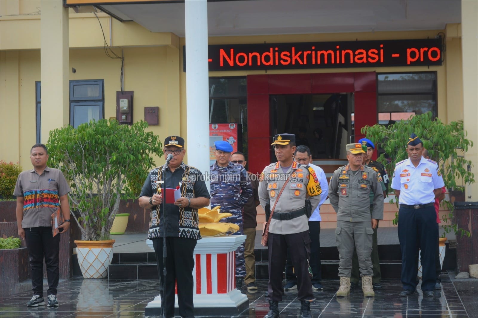Kupang, MN – Penjabat Wali Kota Kupang, Fahrensy Priestley Funay, SE., M.Si., memimpin apel gelar pasukan Operasi Kepolisian Terpusat “Lilin Turangga 2023” dalam rangka pengamanan Natal 2023 dan Tahun Baru 2024 (Nataru), yang berlangsung di lapangan upacara Polresta Kupang Kota, Kamis (21/12). Turut mendampingi Penjabat Wali Kota Kupang, Kapolresta Kupang Kota, Kombes Pol. Rishian Krisna Budhiaswanto S.H., S.I.K., M.H., beserta jajarannya, Perangkat Daerah lingkup Kota Kupang terkait, perwakilan 3 matra TNI, pramuka dan ormas.