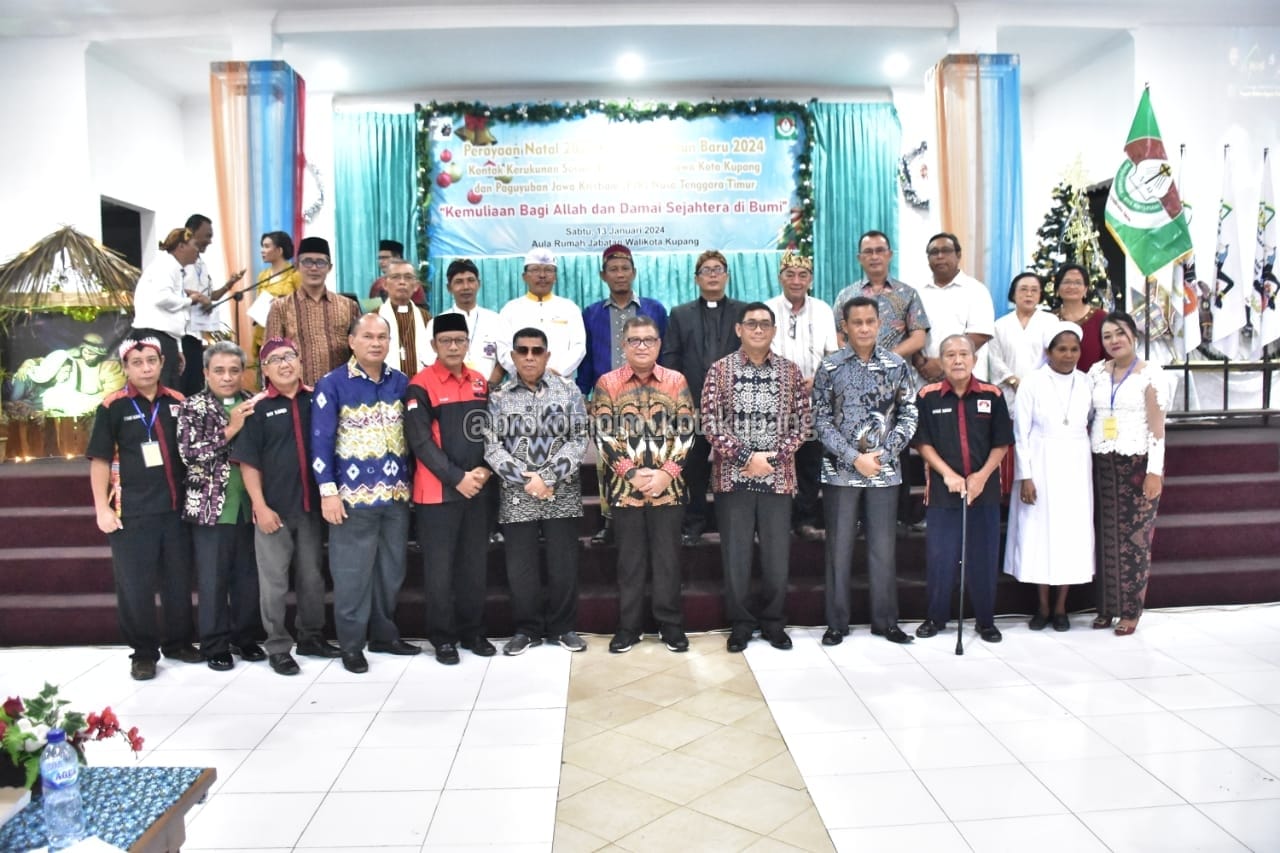 Kupang, MN – Penjabat Wali Kota Kupang, Fahrensy Priestley Funay, SE., M.Si., merayakan Natal Bersama Paguyuban Jawa Kristiani NTT (PJK NTT) dan Kontak Kerukunan Sosial (K2S) Keluarga Jawa Kota Kupang, bertempat di Aula Rumah Jabatan Wali Kota Kupang, Sabtu (13/1). Turut hadir Danlanud El Tari Kupang, Marsma TNI Djoko Hadipurwanto, S.E., M.M., Danrem 161/WS yang diwakili oleh Pabintal Kapten Inf. Nerson Baitanu, SH., Dandim 1604/Kupang, Kolonel Inf. Wiwit Jalu Wibowo, Kapolsek Kelapa Lima, AKP Jemmy Noke, S.H., Tokoh Masyarakat, Ir. Esthon Foenay, M.Si, Ketua K2S Keluarga Jawa Kota Kupang, dr. Muhammad Ikhsan, Ketua Umum PJK NTT, Roy Sudibyo serta para tokoh lintas agama.