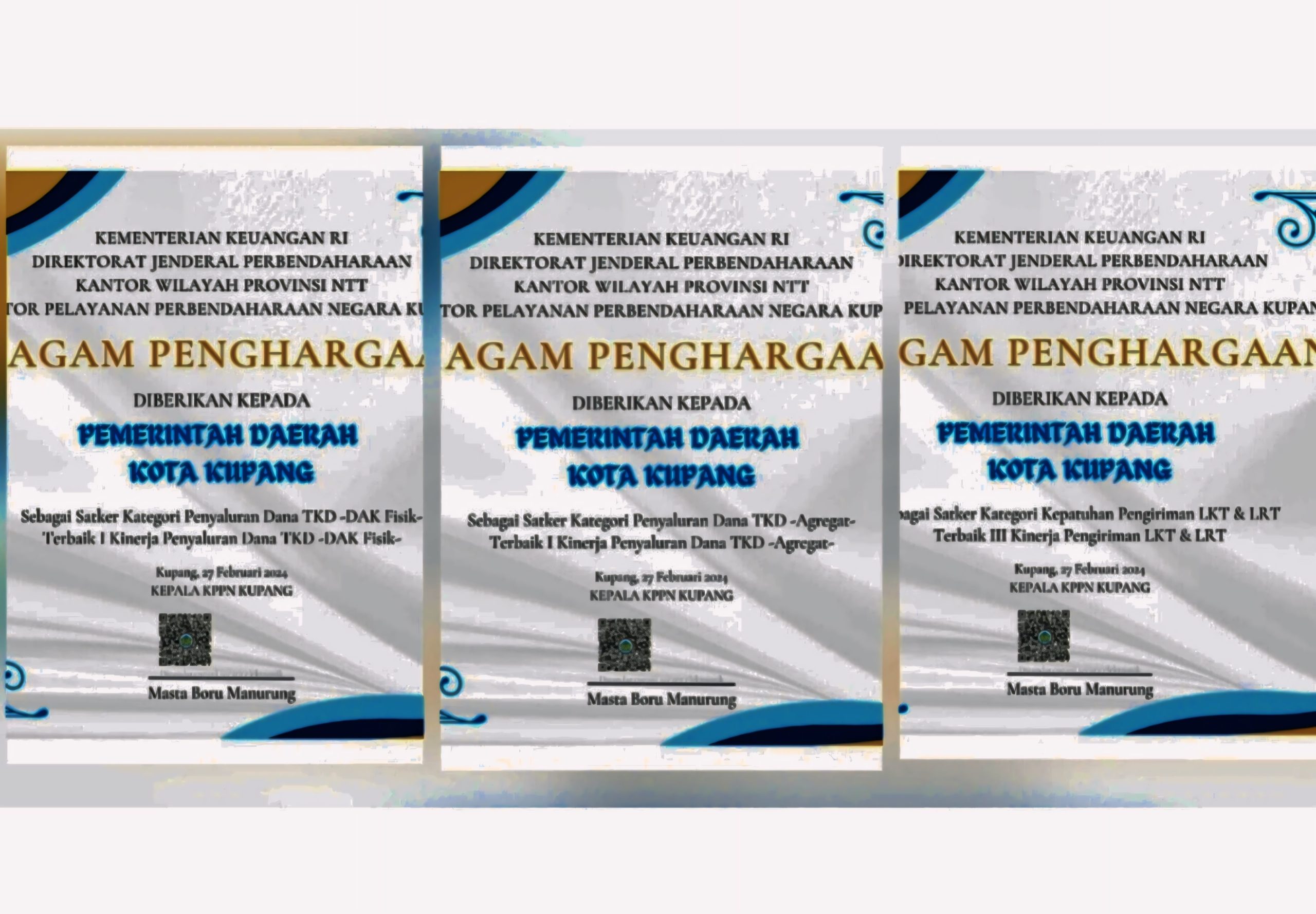 Dalam rangka mendorong peningkatan kinerja pengelolaan dana transfer ke daerah pada wilayah kerja KPPN Kupang Tahun 2024, dijelaskan bahwa, KPPN Kupang memberikan penilaian kinerja Pemerintah Daerah selama periode Tahun Anggaran 2023. KPPN Kupang menganugerahkan TKD Awards Tahun Anggaran 2023 kepada Pemerintah Kota Kupang untuk 3 kategori, antara lain peringkat pertama kategori Kinerja Terbaik Penyaluran Dana TKD (Agregat), peringkat pertama kategori Kinerja Terbaik Penyaluran Dana TKD (DAK Fisik) dan peringkat ketiga kategori Kinerja Terbaik Pengiriman Konfirmasi Pajak atas Beban BUD.