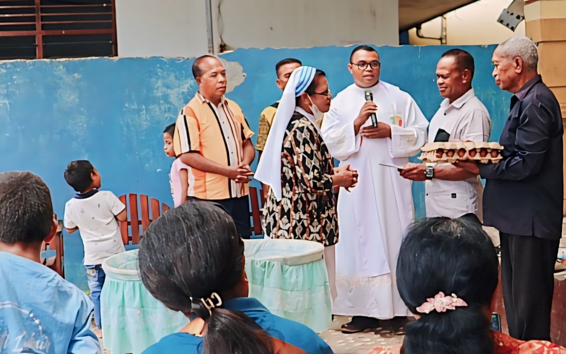 Kupang, MN – Umat Katolik Gereja St. Martinus Stasi St. Yohanes Maria Vianney Naibonat, yang terdiri dari pengurus Stasi, Ketua wilayah, Ketua KUB, Panitia HUT Stasi dan Kelompok Kategorial Gerejani yakni ” Sekami, OMK, Legio Maria, Kharismatik, dan THS-THM pimpinan Pastor RD. Jhon Raimond Septyanto Malo Tilis, mengunjungi sekaligus memberikan bantuan sembako kepada anak-anak berkebutuhan khusus Susteran Alma di Panti Asuhan-Bhakti Luhur di Jln. H.R. Koroh 69, Oebolifo 2 Kecamatan Maulafa, Kelurahan Sikumana, Kota Kupang. Sabtu (27/7/2024)