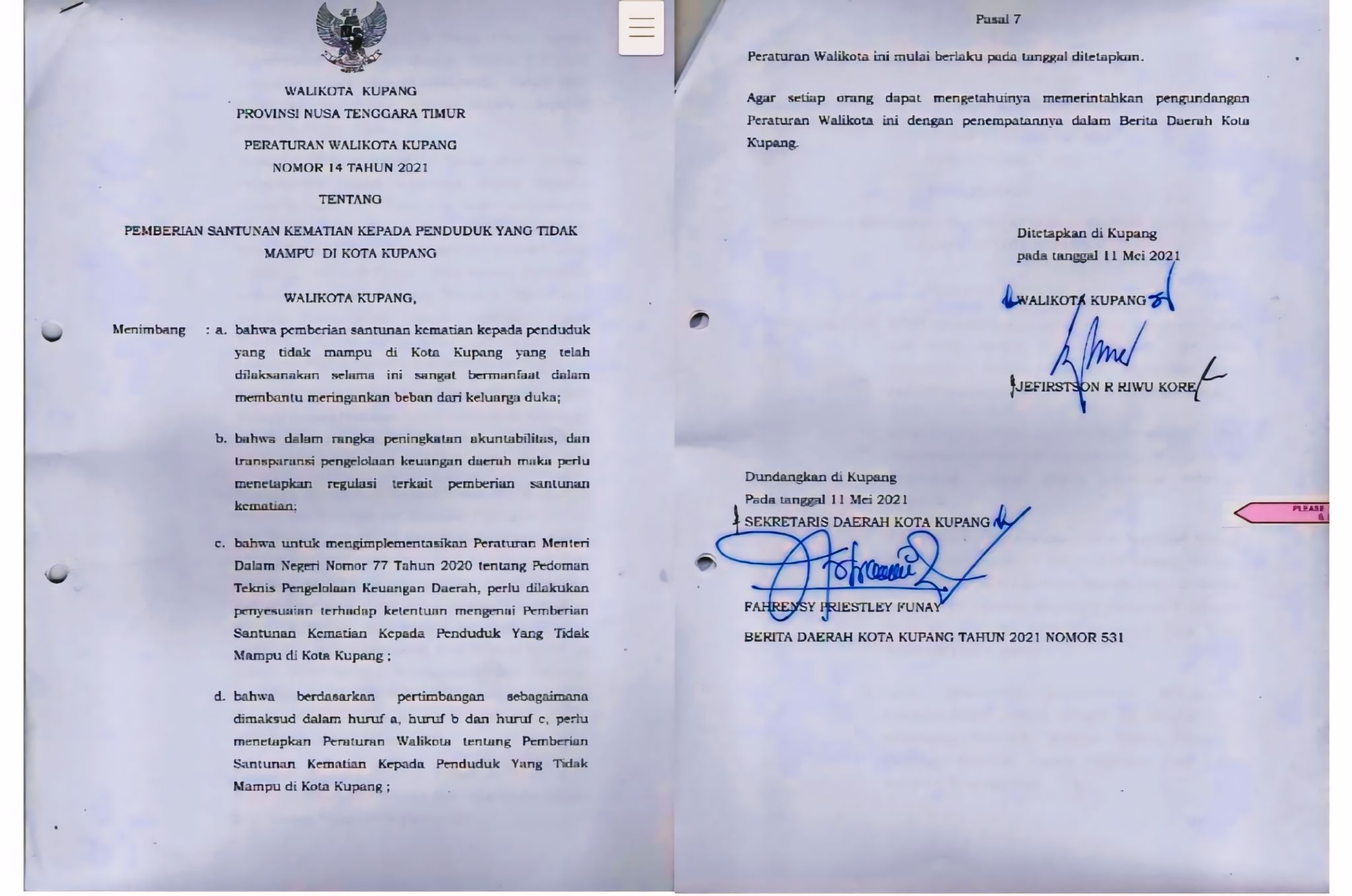 Penyaluran santunan duka pada tahun anggaran 2021 didasarkan pada Peraturan Wali Kota Kupang Nomor 14 tahun 2021. Dalam pasal 4 Perwali tersebut disebutkan jumlah santunan sebesar Rp3.500.000. Perwali itu ditandatangani Wali Kota Jefri Riwu Kore pada 11 Mei 2021.