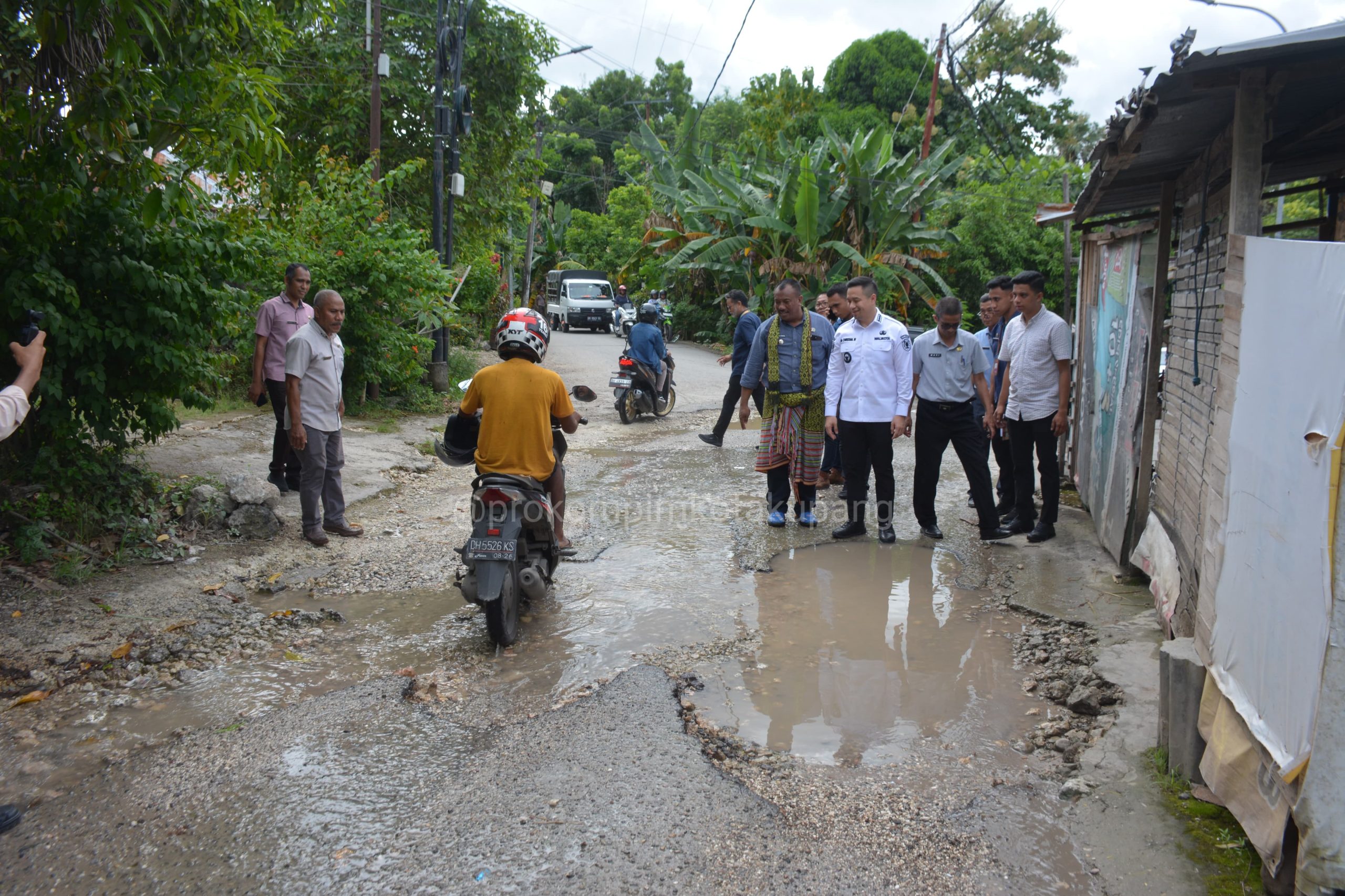 Setelah itu, Wali Kota dan rombongan melanjutkan pemantauan ke persimpangan Jalan HTI Maulafa, yang terletak di antara RT 05 dan RT 06, Kelurahan Maulafa. Kondisi ruas jalan di lokasi ini juga memprihatinkan—air mengalir bebas di sepanjang badan jalan, membentuk genangan serta lubang besar yang membahayakan pengguna jalan.