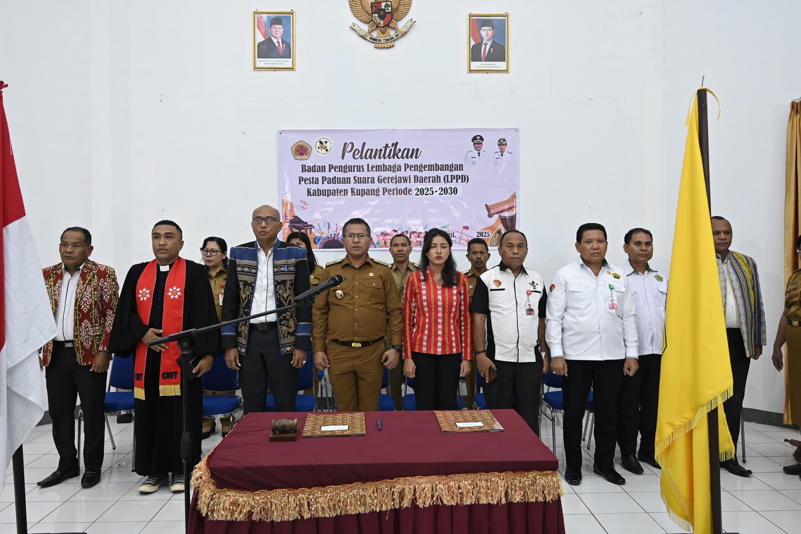 Kupang, MN – Wakil Bupati Kupang, Aurum Titu Eki, melantik Badan Pengurus Lembaga Pengembangan Pesta Paduan Suara Gerejawi Daerah (LPPD) Kabupaten Kupang Periode 2025 – 2030, di aula Rumah Jabatan Bupati Kupang, di Kota Kupang. Senin (14/4/2025)