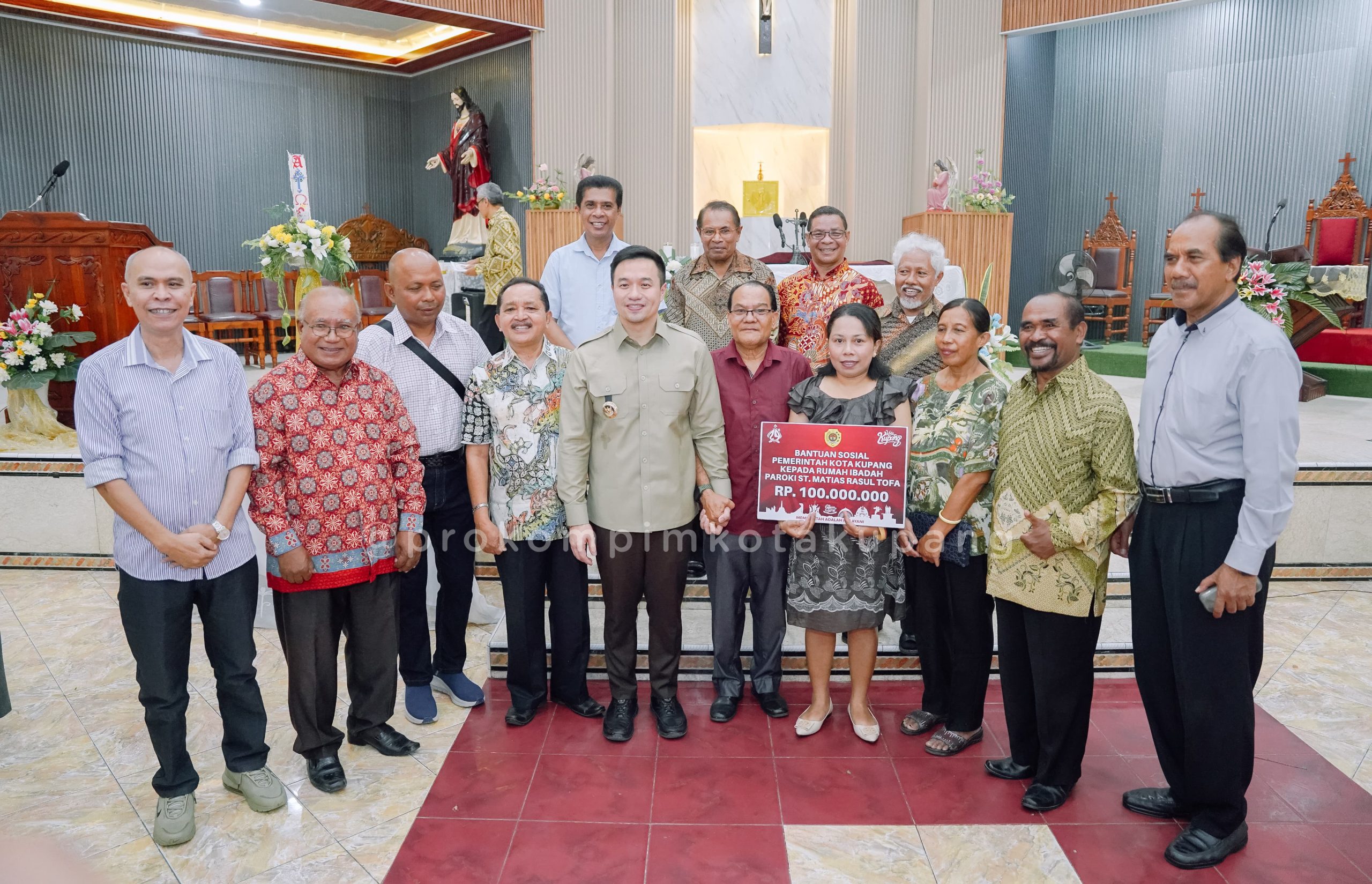 Oelamasi, MN – Wali Kota Kupang, dr. Christian Widodo, mengikuti Misa Minggu Paskah ke 3 sekaligus menyerahkan secara simbolis bantuan dana sebesar Rp100 juta kepada Gereja Katolik St. Mathias Rasul Tofa, Minggu (4/5). Bantuan tersebut merupakan bentuk dukungan Pemerintah Kota Kupang terhadap pelayanan keagamaan dan pembangunan sarana prasarana gereja. Penyerahan dilakukan langsung oleh Wali Kota kepada Ketua Dewan Pastoral Paroki (DPP), Dr. Paulus Taek, M.Si., dan Romo Videntus Atawolo, Pr., sebelum misa berakhir.