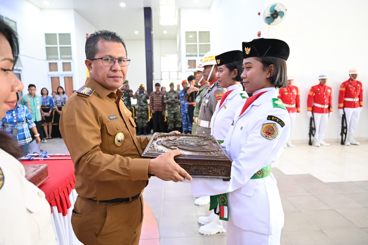Oelamasi, MN – Bupati Kupang Yosef Lede mengukuhkan 45 anggota Pasukan Pengibar Duplikat Bendera Pusaka Merah Putih Tingkat Kabupaten Kupang Tahun 2025, Jumat (15/8/2025) pagi, bertempat di lobi lantai 2 kantor Bupati Kupang Oelamasi.