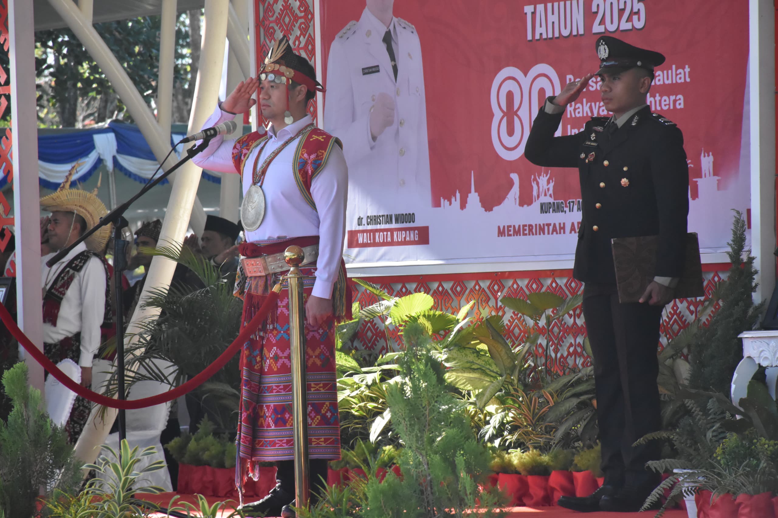 Kupang, MN – Pemerintah Kota Kupang menggelar Upacara Pengibaran Bendera Merah Putih dalam rangka memperingati Hari Ulang Tahun ke-80 Proklamasi Kemerdekaan Republik Indonesia di Lapangan Upacara Kantor Wali Kota Kupang, Minggu (17/08). Upacara yang berlangsung khidmat tersebut dipimpin langsung oleh Wali Kota Kupang, dr. Christian Widodo, sebagai inspektur upacara.