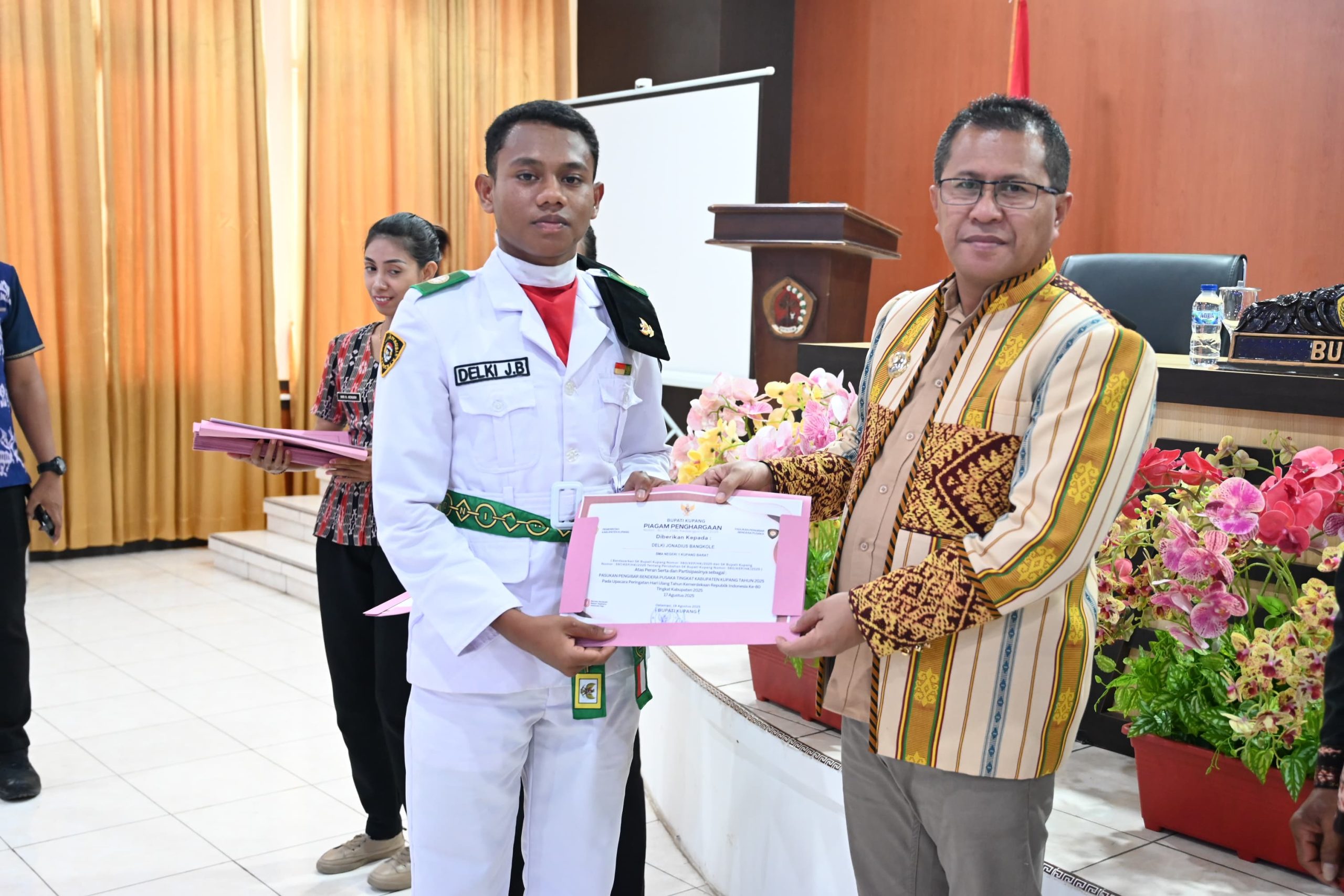 Oelamasi, MN – Bupati Kupang, Yosef Lede, menyerahkan Serifikat Paskibra kepada para anggota Pasukan Pengibar Bendera (paskibra) Kabupaten Kupang 2025, di aula Kantor Bupati Kupang, Oelamasi. Kamis (13/11/2025) pagi