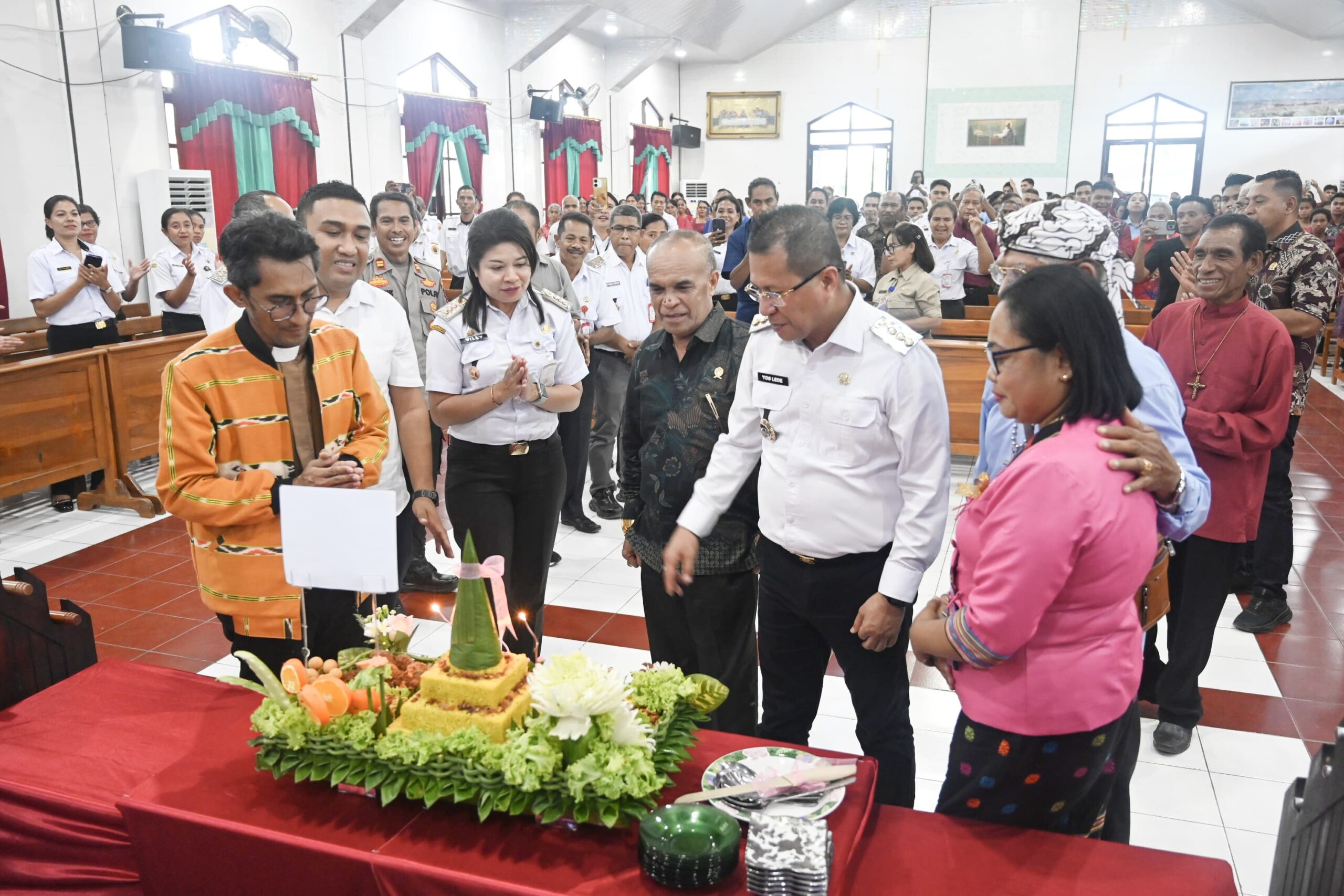 Tablolong, MN – Bupati Kupang, Yosef Lede, menghadiri perayaan Hari Ulang Tahun (HUT) ke-23 Gereja GMIT Amanau Tablolong, Klasis Kupang Barat, dan peletakan batu pertama pembangunan gedung serbaguna jemaat yang berlangsung khidmat dan dipimpin oleh Pdt. Yandi Manobe, S.Th. Perayaan ini berlangsung pada Rabu, (22/4/2026) siang di Gedung Kebaktian GMIT Amanau Tablolong, Desa Tablolong, Kecamatan Kupang Barat.